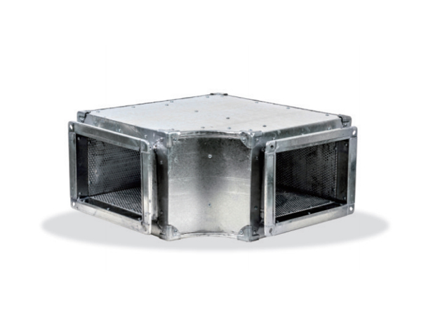 消聲彎頭例似于管道消聲器,也是阻抗消聲器中的一種,是將直管的消聲器變?yōu)閺澒艿南暺鳌? ·結(jié)構(gòu) 消聲腔內(nèi)壁填塞50mm厚離心玻璃棉,外覆玻璃布及3mm孔徑多孔板,龍骨為鍍鋅板。 主要技術(shù)參數(shù):消聲量:7dB(A) 阻力損失:2.5mmH,O(當風速為6m/s時)